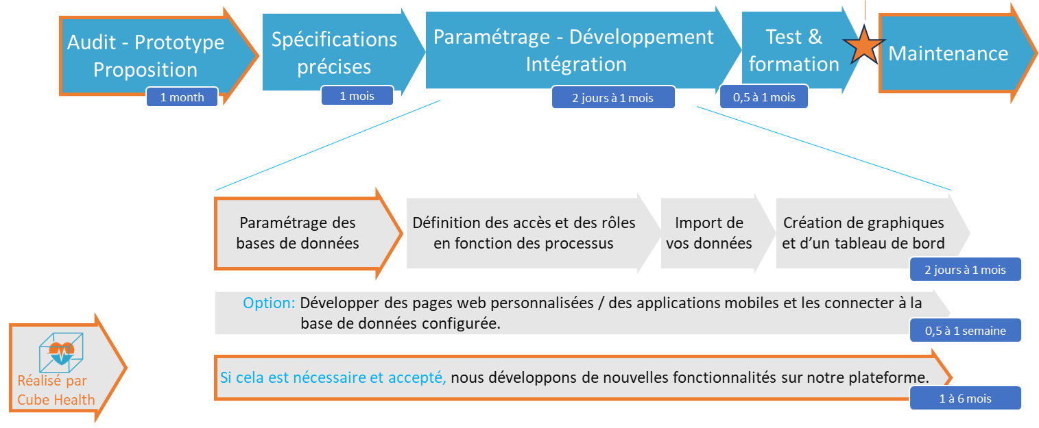 L'objectif de cube.health est de participer au développementd'applications innovantes et agiles qui vont transformer ce secteur,en proposant une plateforme low-code qui accélère et simplifie grandement le développement de ces applications.